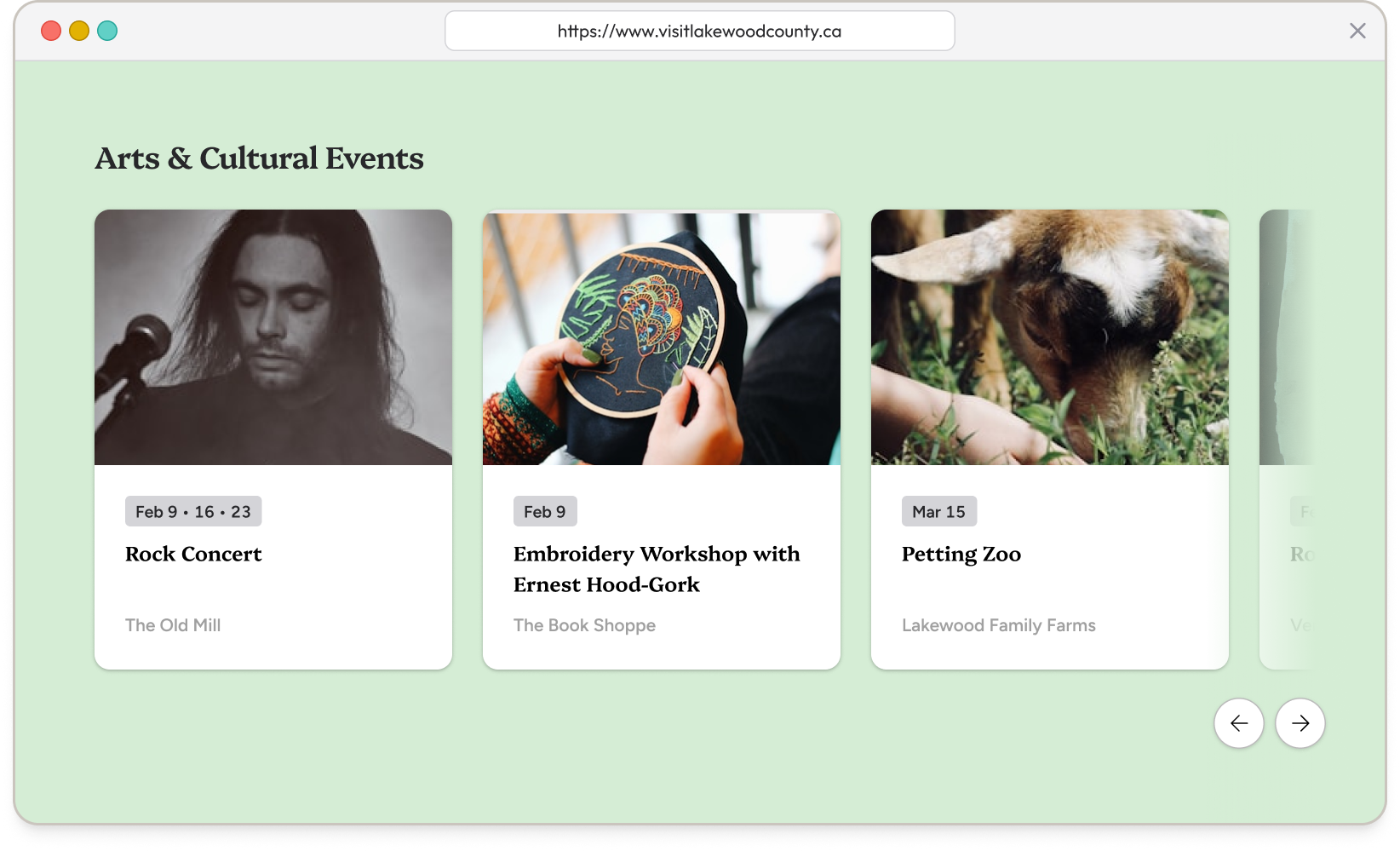 - Event Widgets can be filtered by date, month, event type, or any custom tag you’ve applied.